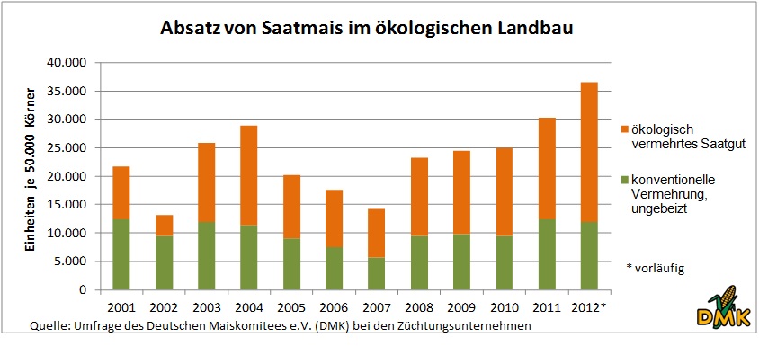 Im ökologischen Landbau ist die Verwendung von Saatmais aus ökologischer Erzeugung vorgeschrieben. Falls die gewünschte Sorte nicht als Ökoware erhältlich ist, kann über eine Ausnahmegenehmigung ungebeizter Saatmais aus konventioneller Erzeugung eingesetzt werden. In den vergangenen Jahren stammten jeweils rund 60 % des ausgesäten Saatmaises aus ökologischer Erzeugung. Zu knapp 40 % wurde ungebeizter Saatmais aus konventioneller Erzeugung verwendet. Für 2012 rechnen die Züchter damit, dass erstmals über 65 Prozent des Saatmaises aus ökologischer Erzeugung stammen.