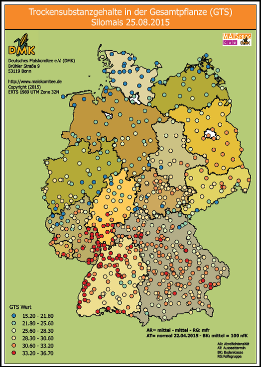 Die schnelle Abreife der Maisrestpflanze in einigen Regionen Süddeutschlands ist in diesem Jahr durch die lang anhaltende Trockenheit von Juli bis Mitte August begründet, während in den Niederungs- und Höhenlagen, sowie in den Küstenregionen die Abreife der Maisbestände normal verläuft. Insgesamt lässt sich gegenwärtig eine deutliche Nord-Süd-Trennung bei der Abreife der Silomaisbestände festhalten (s. angefügte Karte).