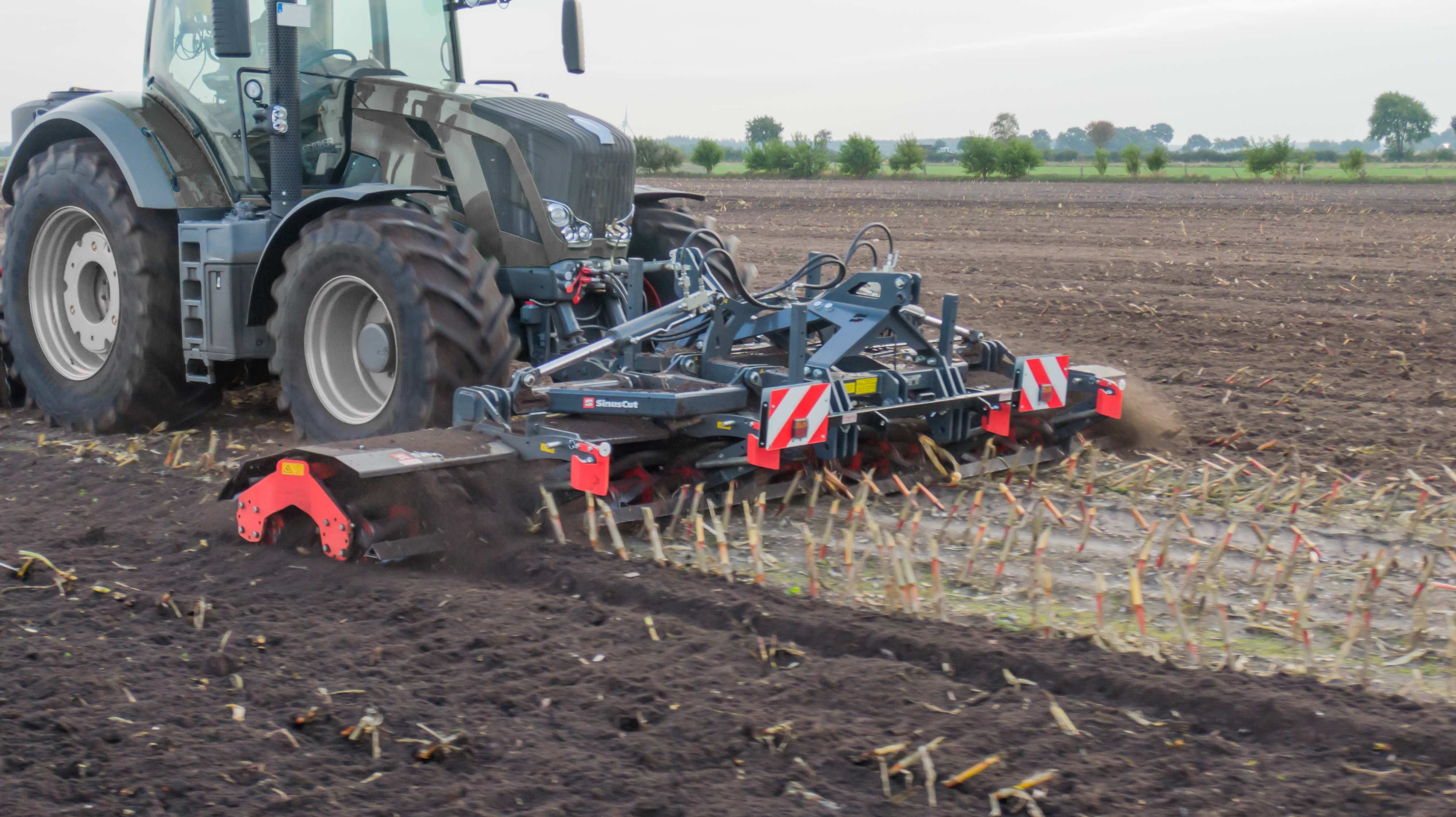 Die SAPHIR SinusCut 6,00 Meter ist mit einem Front-Heckbock ausgestattet, um die Maschine variabel einsetzen zu können. Im Frontanbau sorgt der serienmäßige Lenkbock für optimale Fahreigenschaften. Sie zeichnet sich durch ihre einzigartig gewendelten Doppel-Messerwalzen aus. Dadurch wird ein bisher unerreichtes Abroll- und Schnittverhalten erzielt. Die Walze läuft auch bei hohen Arbeitsgeschwindigkeiten besonders laufruhig und hält dadurch sehr exakt die Arbeitstiefe ein. Die Messerwalze lässt sich somit optimal für die Zerkleinerung von Zwischenfrüchten und die Ernterestezerkleinerung nach Raps- und Mais einsetzen. Sie spleißt die Stoppeln auf um die Rotte anzuregen und den Schadinsekten keinen Rückzugsort zu bieten. Auch für die SC600 gibt es optional die bewährte Impulsschiene. Sie schert Stoppeln ab, spleißt den Wurzelhalsbereich auf und richtet die Stoppel für den engmaschigen Schnitt im Sinusraster aus. Gerade in der Raps- und Maisstoppelbearbeitung kann dadurch der Wirkungsgrad im Vergleich zur Messerwalze solo deutlich erhöht werden. Durch die zwei entgegenlaufenden Messerwalzen ergibt sich daraus das einzigartige Sinusraster, wodurch ein engmaschiges Schnittraster entsteht. Organische Reste werden auf diese Weise effizient zerkleinert.