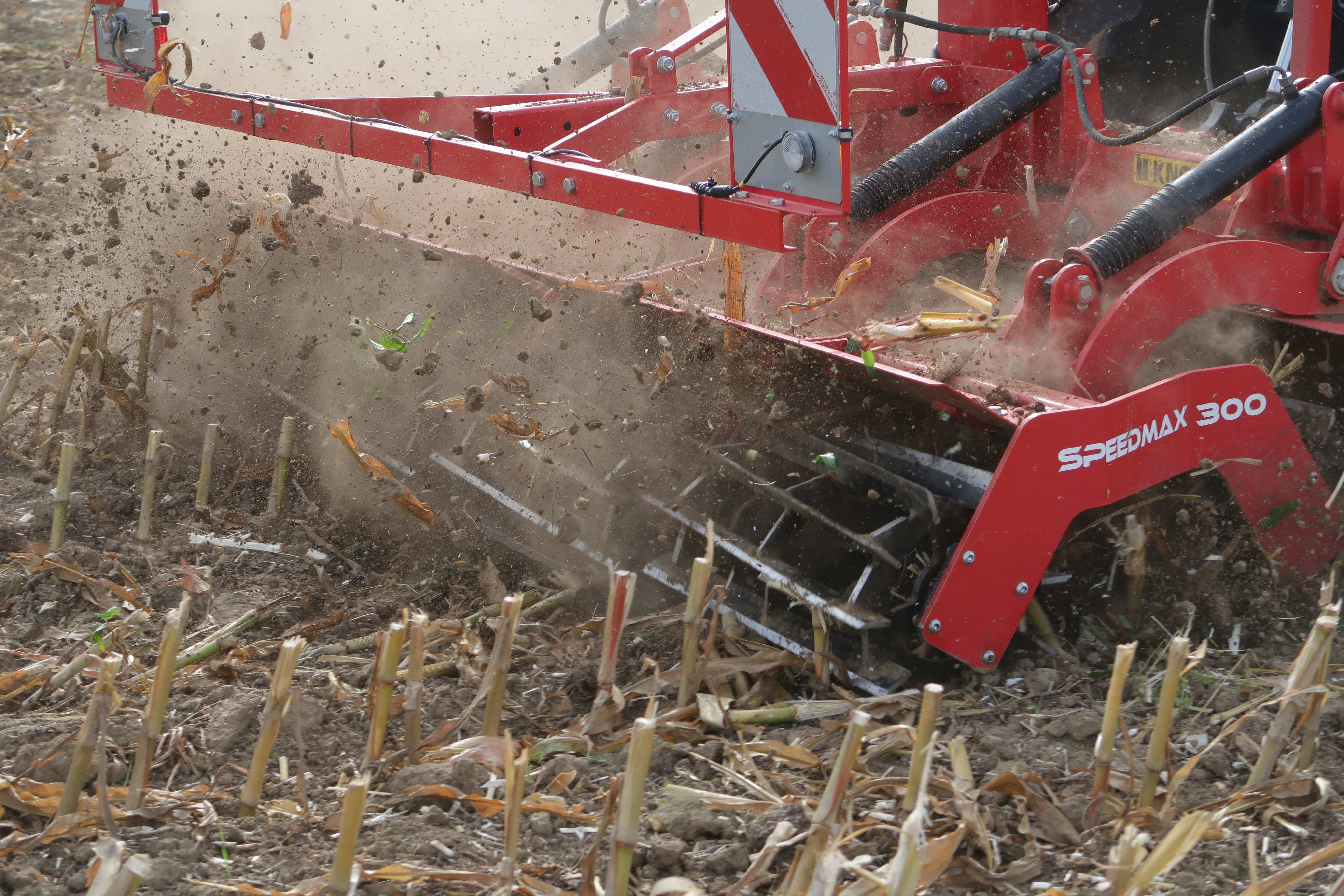 Mit der Speedmax hat Knoche ein hocheffizientes Arbeitsgerät zur Restpflanzenzerkleinerung im Programm. Mit den zwei hintereinander liegenden Walzen mit 390 mm Durchmesser und gegenläufigen Messern erzielt das Gerät einen sehr engen Kreuzschnitt auf dem Boden. Als "Open Cage" Technik bezeichnet Knoche die Walzenkonstruktion ohne Innenachse. Von Vorteil ist diese Technik insbesondere bei großen Mengen Restpflanzenmaterial oder feuchtem Boden. Ebenfalls von Vorteil die kurzen Walzenabschnitte mit nur 75 cm Breite pro Element, welche eine optimale Anpassung an die Bodenkontur ermöglichen und auch Unebenheiten durch Schlepperspuren bearbeiten. Bei extrem geringem Kraftstoffverbrauch kann mit der Speedmax eine Arbeitsgeschwindigkeit von bis zu 25 km/h gefahren werden.