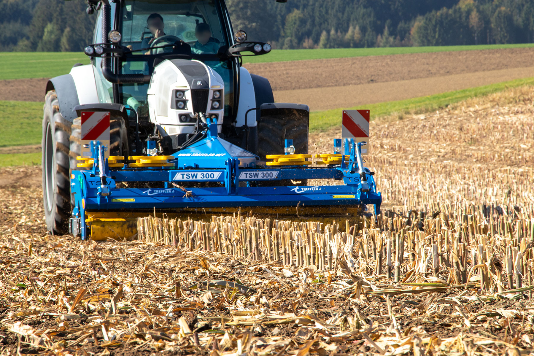 Die TREFFLER Schneidwalze besteht aus 3 Walzen. Die erste geschlossene Walze ist in der Höhe beweglich gelagert und knickt die Pflanzen oder Stoppeln in Fahrtrichtung um. Anschließend schneiden die beiden folgenden Messerwalzen die umgeknickten Pflanzen quer zur Fahrtrichtung. Dadurch wird die Pflanze der Länge nach geschnitten. Die beiden Messerwalzen mit je 7 Schneiden auf dem Radius verteilt, sind mit einer Kette verbunden. Die Walzen werden über die Kette so gesteuert, dass die hintere Messerwalze genau zwischen den Schnittabstand der ersten Messerwalze schneidet. So erreicht die Schneidwalze einen gleichmäßigen Schnitt.
